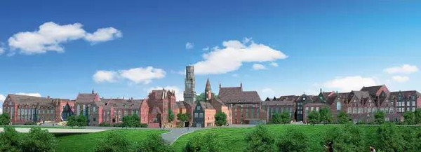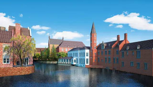 參考比利時*城市布魯日連綿小建筑物的街區.點,結合紅磚外墻、階梯式陡坡屋.等外觀.征,以及.具.色的鐘塔和拱形石橋設計,形成了與自然環境*契合的街區空間.